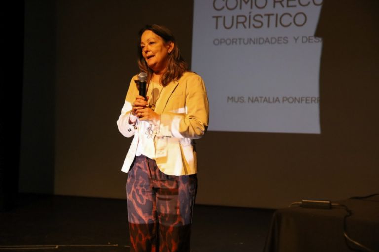 La disertación estuvo a cargo de la actual diputada provincial, museóloga y ex Secretaria de Estado de Turismo de la provincia, Natalia Ponferrada, quien ante un público conformado por estudiantes y docentes de turismo, guías y anfitriones turísticos, emprendedores, turistas y público en general, ahondó sobre los diferentes tipos de patrimonio, el abordaje histórico del término, para luego reflexionar el por qué hoy representa una premisa clave para ofrecer un destino turístico con identidad.