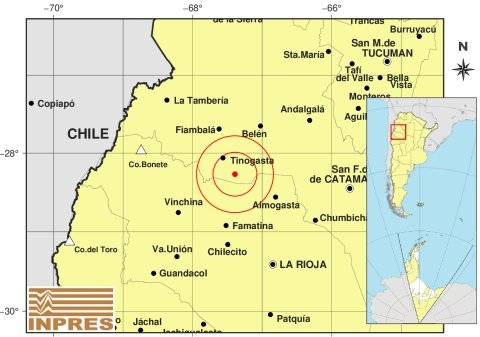 Epicentro: 28 km al SE de Tinogasta; 65 km al NO de Aimogasta; 77 km al SO de Belén -28.269 (lat) -67.391 (long)