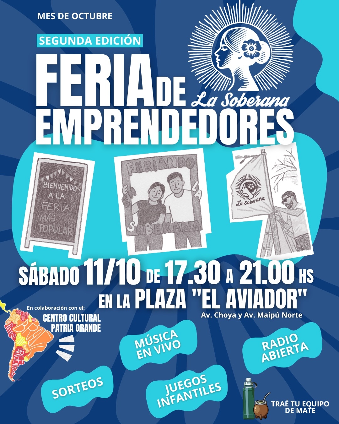 El Taller La Soberana, junto al Centro Cultural Patria Grande, invitan a participar de la Segunda edición de la feria de emprendedores “La Soberana”, que se realizará este sábado 11 de octubre a partir de las 17:30 horas, en la Plaza del Aviador (entre Av. Maipú Norte y Av. Choya).