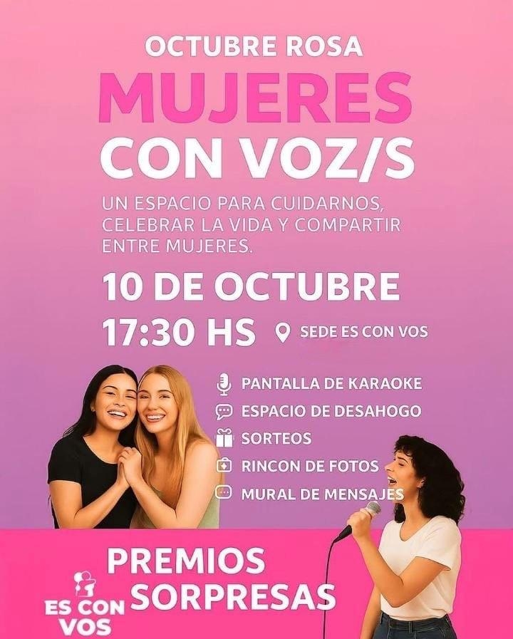 Este jueves 10 de octubre a las 17:30 hs, la sede Es Con Vos (Rojas 542,) será escenario de una jornada muy especial: “Mujeres con Voz/s”, una propuesta pensada para cuidarnos, celebrar la vida y compartir entre mujeres, en el marco del mes de concientización sobre el cáncer de mama.