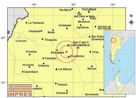 Epicentro: 26 km al N de Chumbicha; 47 km al E de Aimogasta; 57 km al O de Catamarca -28.63 (lat) -66.334 (long)