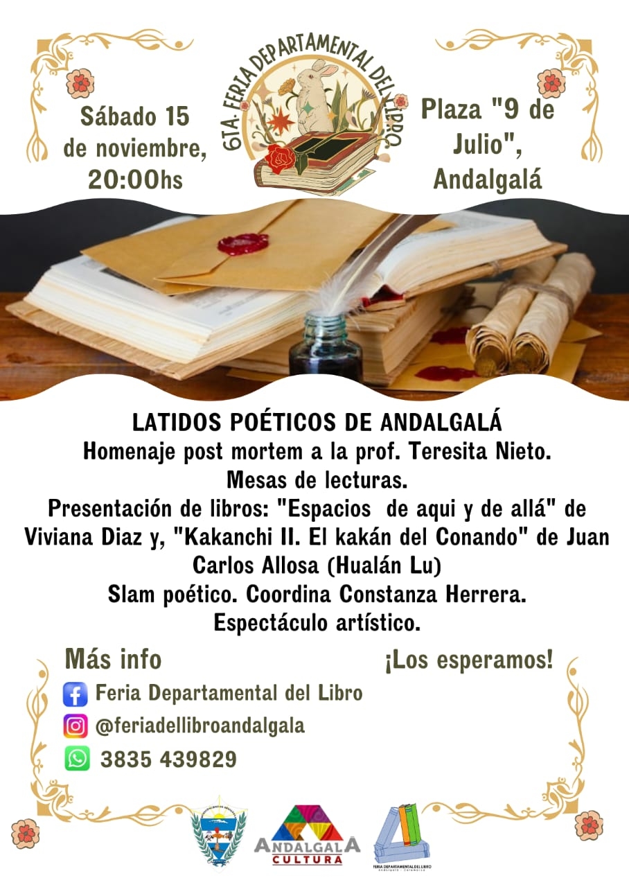 La 6ta. Feria Departamental del Libro de Andalgalá vivirá uno de sus momentos más emotivos con la velada cultural “Latidos poéticos de Andalgalá”, donde se rendirá homenaje póstumo a la profesora Julia Teresita Nieto. El reconocimiento se realizará el sábado 15 de noviembre, a las 20 horas, en la plaza 9 de Julio, en el marco de una jornada dedicada a valorar la palabra y honrar la identidad artística catamarqueña.
