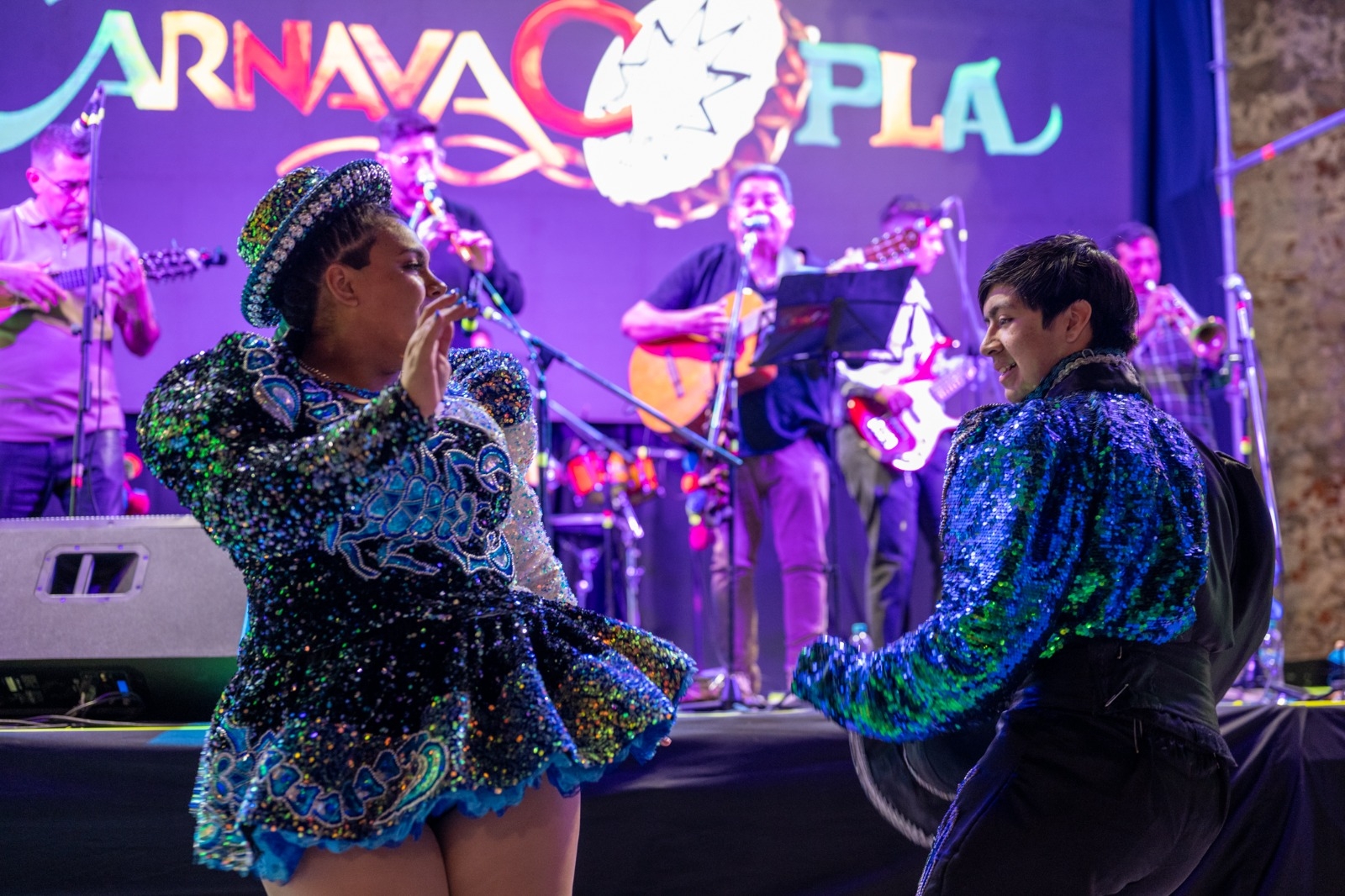 Más tarde, el escenario se llenó de ritmo y color con la presentación de Carnavacopla, que interpretó sayas, coplas y carnavalitos, que fueron acompañadas por bailarines y que el público aplaudió y palmeó con gran entusiasmo.