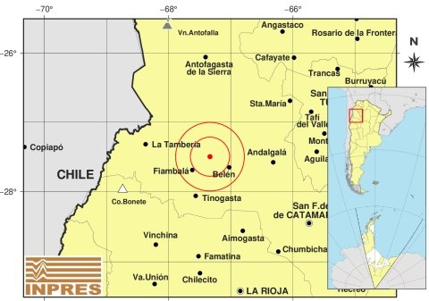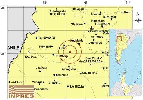 Epicentro: 34 km al NO de Belén; 67 km al N de Tinogasta; 77 km al S de Culampajá -27.499 (lat) -67.334 (long)