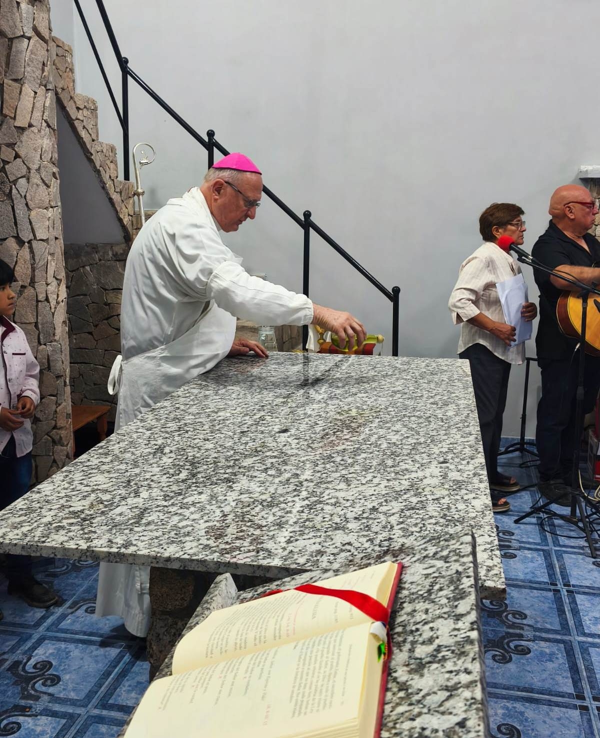 En la oportunidad se dio lectura al decreto correspondiente y el Obispo bendijo el agua con la que roció a todos los presentes, el templo, el altar y el ambón desde donde luego se proclamó la Palabra de Dios.