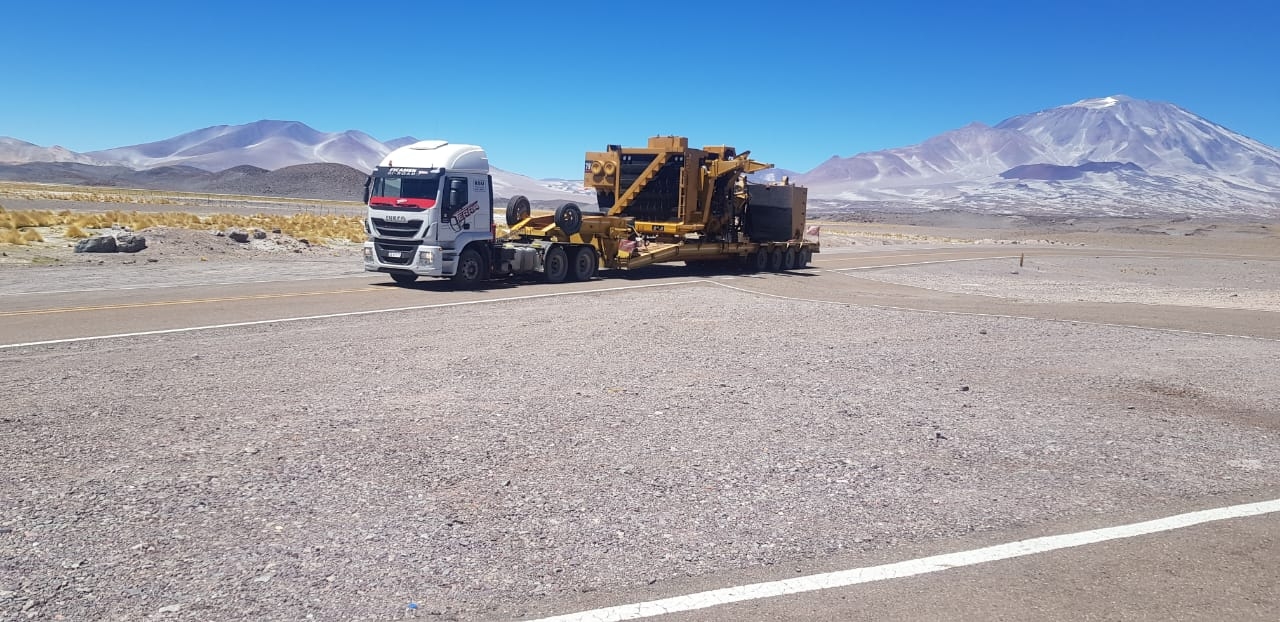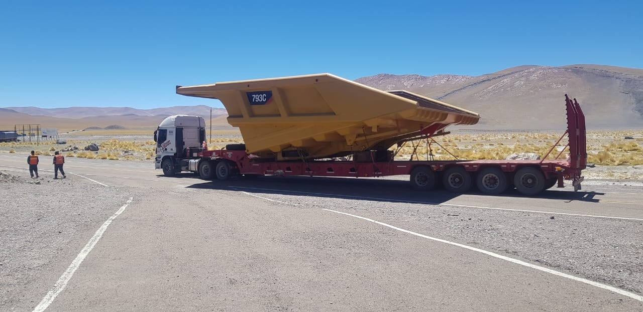 El transporte está a cargo de tres camiones con carretones que movilizan equipos con un *ancho de más de cinco metros*, medida que ocupa gran parte de la calzada, que es de 6,70 metros.