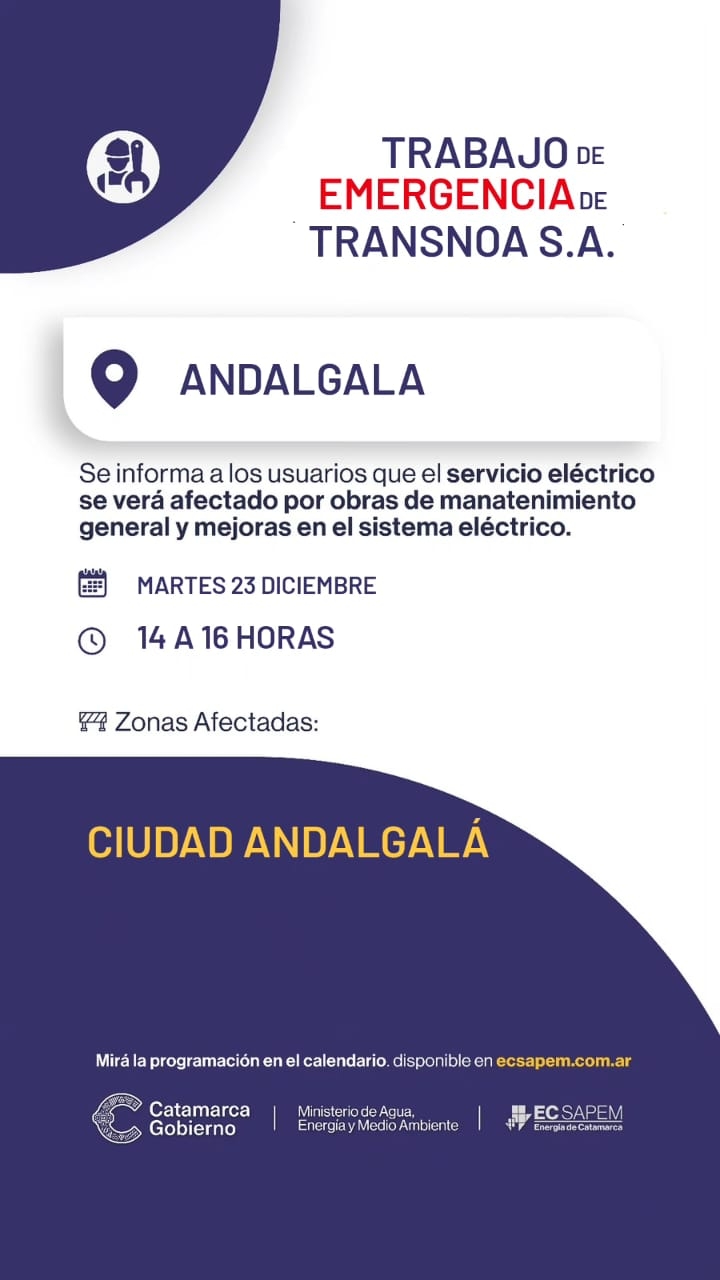 Como consecuencia de estos trabajos, el suministro eléctrico se verá interrumpido este martes de 14 a 16 horas, afectando a la ciudad de Andalgalá.
