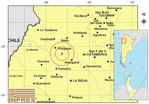 Epicentro: 40 km al SE de Tinogasta; 52 km al NO de Aimogasta; 76 km al S de Belén -28.306 (lat) -67.251 (long)