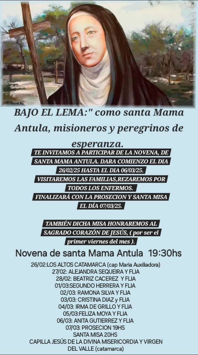 El cierre de los actos litúrgicos se llevará a cabo el viernes 7 de marzo a las 19.00, con la procesión por las calles del pueblo, luego se celebrará la Santa Misa comunitaria, en la que también se honrará al Sagrado Corazón de Jesús por ser el primer viernes del mes, en capilla Jesús de la Divina Misericordia y Virgen del Valle, de la localidad de Lavalle, sector Catamarca.