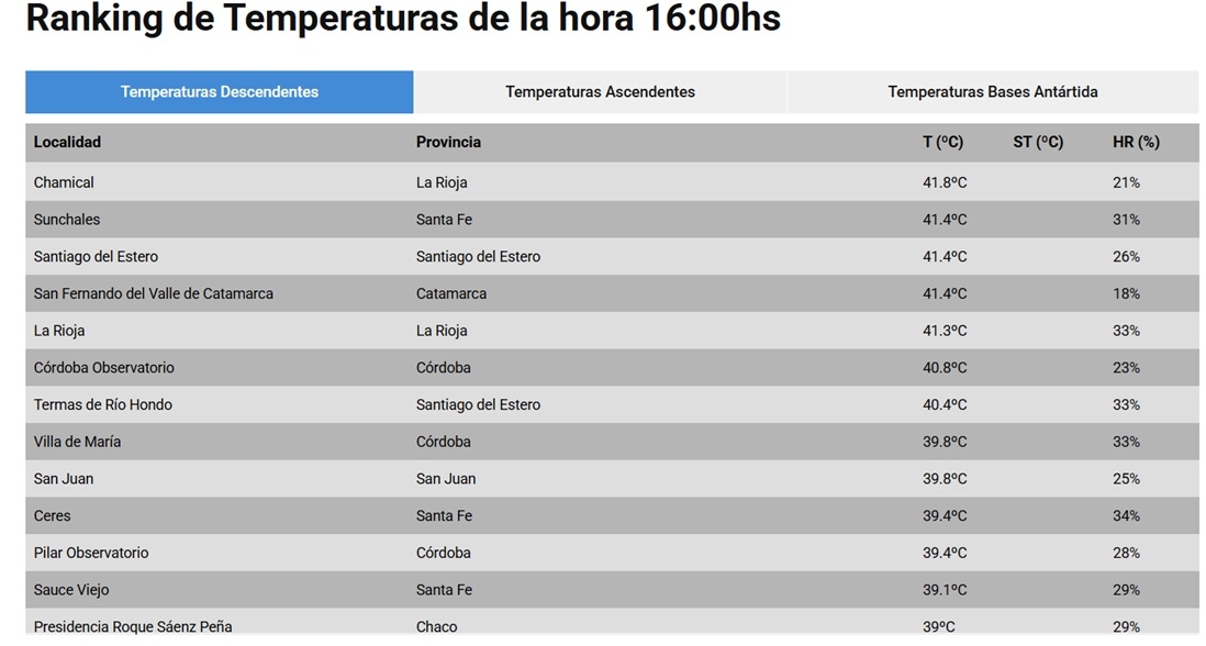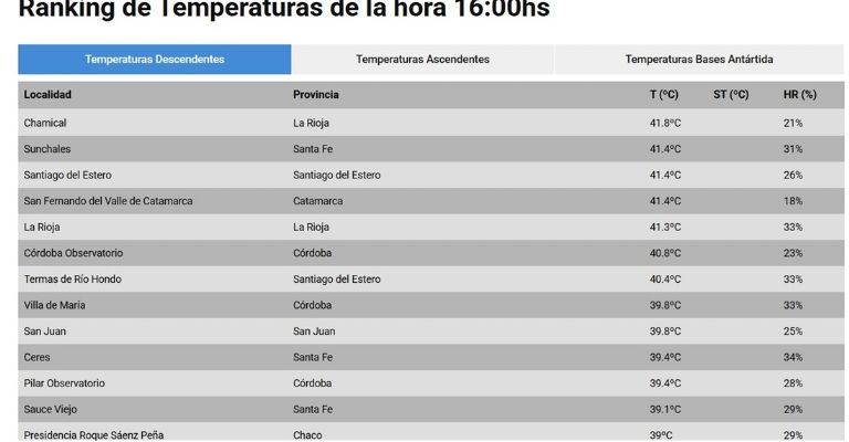 El primer lugar es para Chamical en La Rioja, con 41.8°; segundo Sunchales en Santa Fe con 41.4° al igual que Santiago del Estero que está tercera. Catamarca por su parte está en el cuarto puesto pero también con 41.4°.