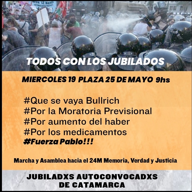 Los jubilados Autoconvocados volverán a marchar el próximo miércoles a las 9 horas en la Plaza 25 de Mayo. Además realizarán una asamblea de cara a la movilización por el 24 de Marzo, día de la Memoria, Verdad y Justicia.