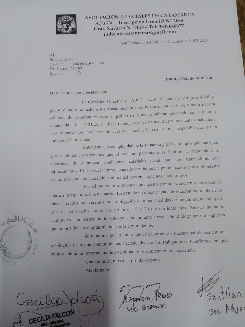 El gremio AJUCA informó hoy que la adhesión al paro por 24 horas sin asistencia a los lugares de trabajo en el Poder Judicial de Catamarca fue de un 80% en el turno mañana, paralizando casi totalmente la actividad en ese poder del Estado.
