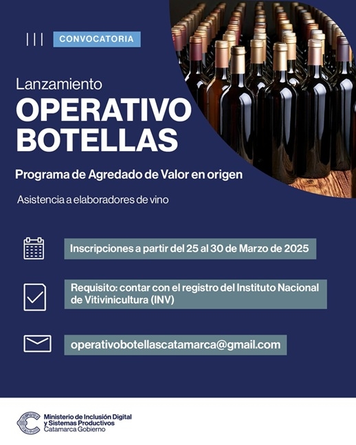 El Ministerio de Inclusión Digital y Sistemas Productivos, a través de la Dirección de Certificación, Comercialización y Agricultura Sostenible, dependiente de la Secretaria de Producción anuncia la apertura de inscripciones para el Quinto Operativo Botellas 2025, una iniciativa del Programa de Agregado de Valor en Origen destinada a asistir a los elaboradores de vino de la provincia mediante el abastecimiento de botellas Burdeos 750 cc cónica baja.