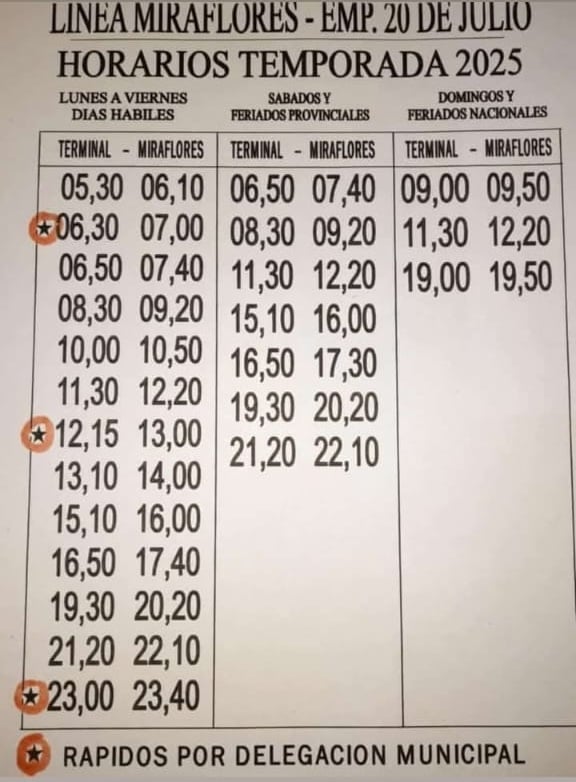 Finalmente, quiero señalar una irregularidad en la tarifa del boleto. Por ejemplo, el costo del pasaje entre Miraflores y Calle 8 (Nueva Coneta) es de $1400, cuando debería considerarse un boleto urbano, ya que no se cruza un límite departamental que justifique el cambio de tarifa.
