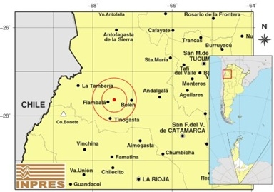 Epicentro: 42 km al O de Belén; 49 km al N de Tinogasta; 95 km al S de Culampajá -27.641 (lat) -67.460 (long)