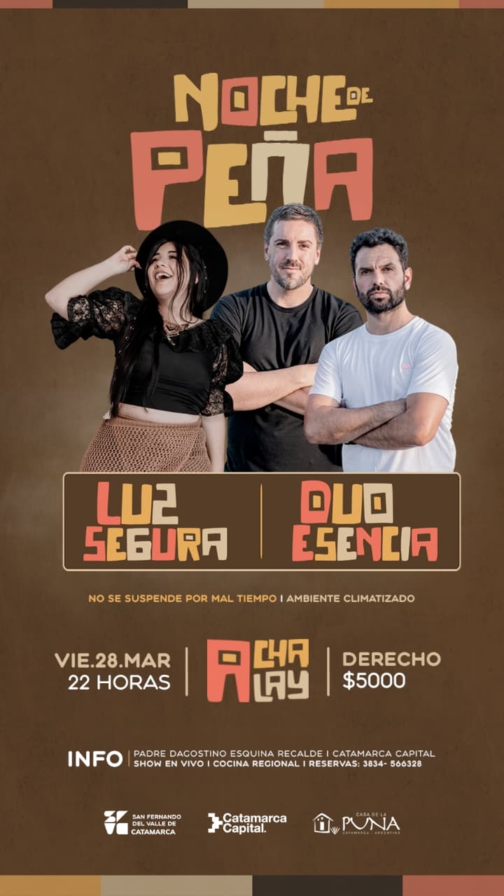 Noches de Peña en Casa de la Puna con la presentación de Luz Segura y Dúo Esencia. Hora: 22:00. Derecho de espectáculo: $5.000.