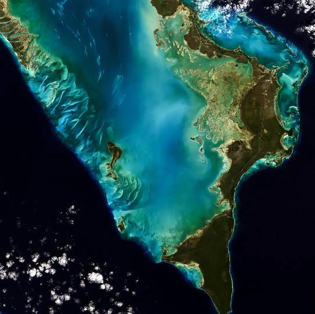 Esta imagen en color natural de la isla de Eleuthera, en las Bahamas, fue tomada por el satélite Landsat. Entre Landsat 8 y Landsat 9, el programa Landsat ofrece una cobertura completa de la superficie de la Tierra cada ocho días.
