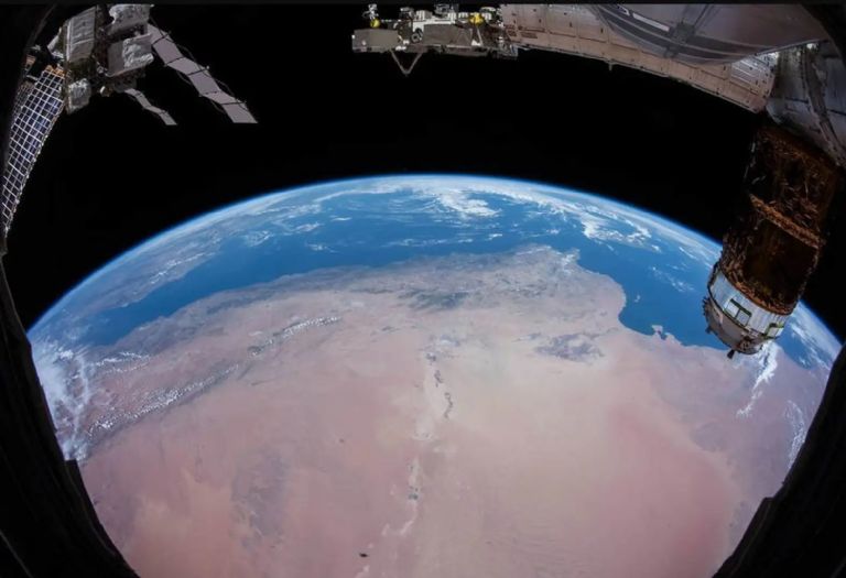 Esta imagen muestra el norte de África y el mar Mediterráneo mientras la Estación Espacial Internacional orbitaba sobre el continente africano. El vehículo japonés Kounotori H-II Transfer Vehicle-7 (HTV-7) aparece a la izquierda acoplado al módulo Harmony. A la izquierda, parte de los paneles solares y radiadores de la estación.
