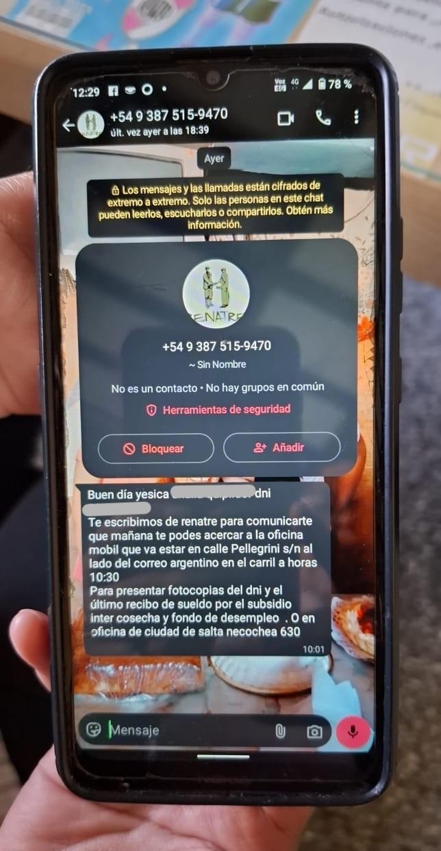Uno de estos mensajes, difundido en la provincia de Salta, incluía el logo institucional antiguo como imagen de perfil, y utilizaba el nombre completo y número de documento de una trabajadora, convocándola a una supuesta actividad del Registro en la localidad de El Carril. Dicho número no pertenece a ningún canal oficial de comunicación del organismo.