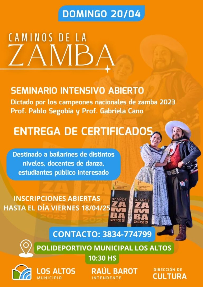 Este domingo 20 de abril, la ciudad de Los Altos será sede de un evento cultural de gran relevancia para los amantes del folclore: el Seminario Intensivo Abierto "Caminos de la Zamba", una jornada especial que estará a cargo de los campeones nacionales de zamba 2023, los profesores Pablo Segobia y Gabriela Cano.