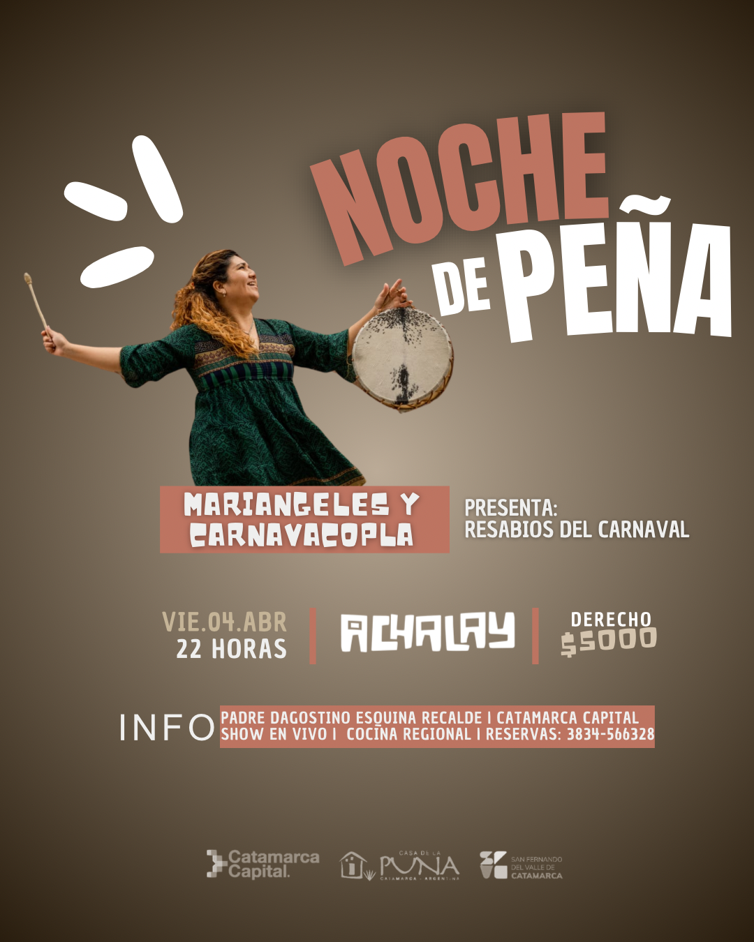 “Resabios de Carnaval” se denomina la propuesta que comenzará a las 22 hs. y que presentará a la cantante y coplera Mariángeles, al grupo Carnavacopla y a la Comparsa Diaguita, especialmente invitada desde Mutquín, Pomán.
