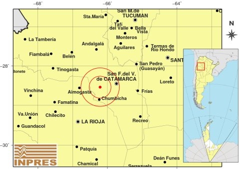Epicentro: 34 km al N de Chumbicha; 43 km al O de Catamarca; 59 km al E de Aimogasta -28.541 (lat) -66.211 (long)