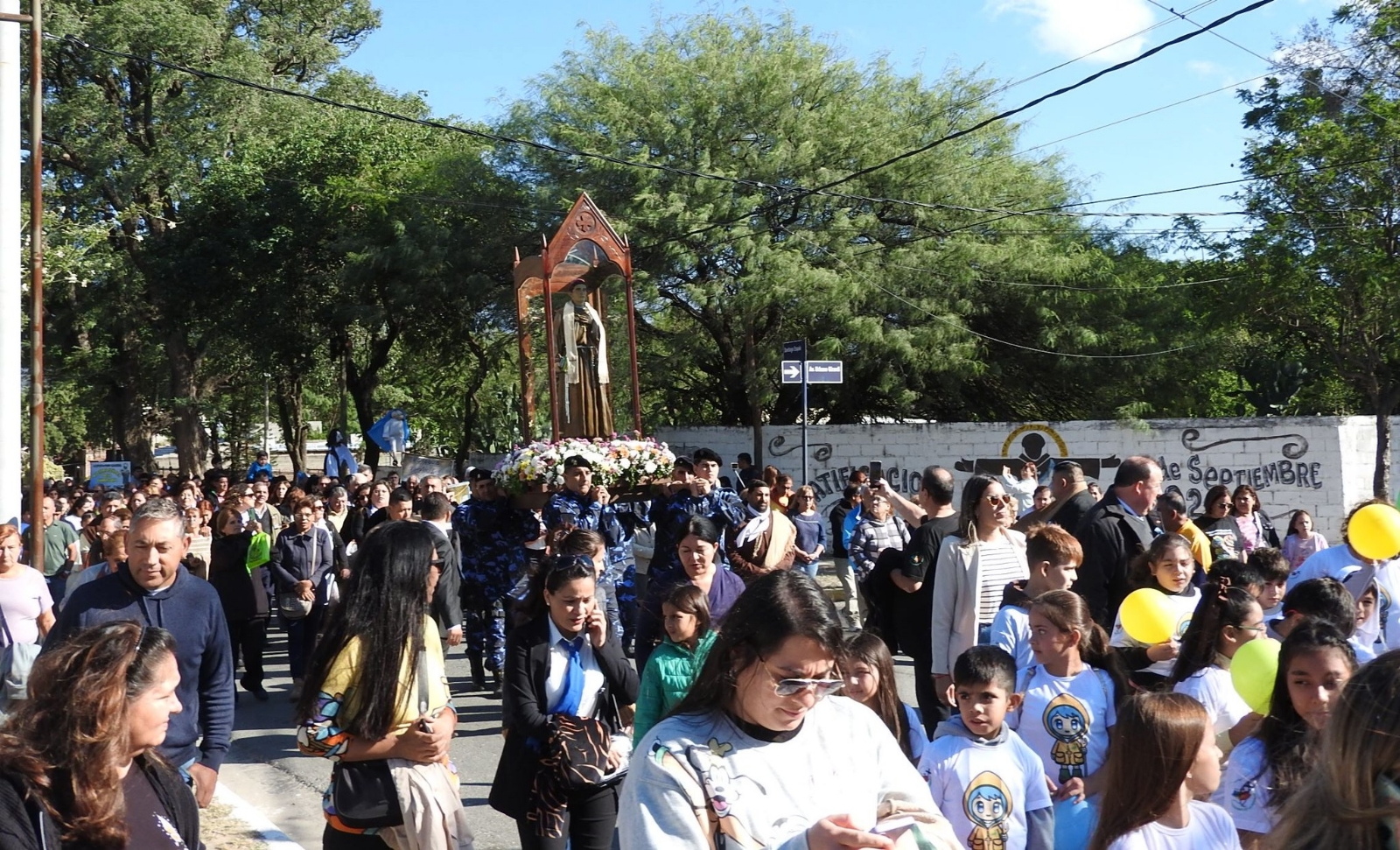 La alegre caminata se desplazó alrededor de la plaza de Piedra Blanca, entre cantos y reflexiones, llegando a la Casa Natal donde la imagen del Beato Esquiú fue recibida con los sones de la Banda de Música de la Policía de la Provincia, tomando ubicación para el desfile en honor.