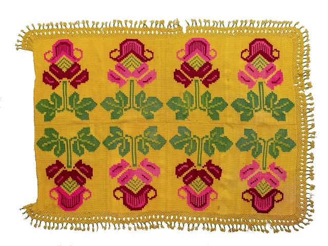 Se trata de una manta tejida y bordaba artesanalmente, compuesta por dos paños de aproximadamente 65 cm cada uno, de color amarillo ocre. La pieza presenta cuatro grandes motivos florales por paño, bordados en tonos de rosa, bordó y verde, con una estética que remite a representaciones estilizadas de flores o plantas. El borde está terminado con un trabajo de macramé en hilo amarillo ocre, acompañado de borlas verdes, en tres de sus lados.