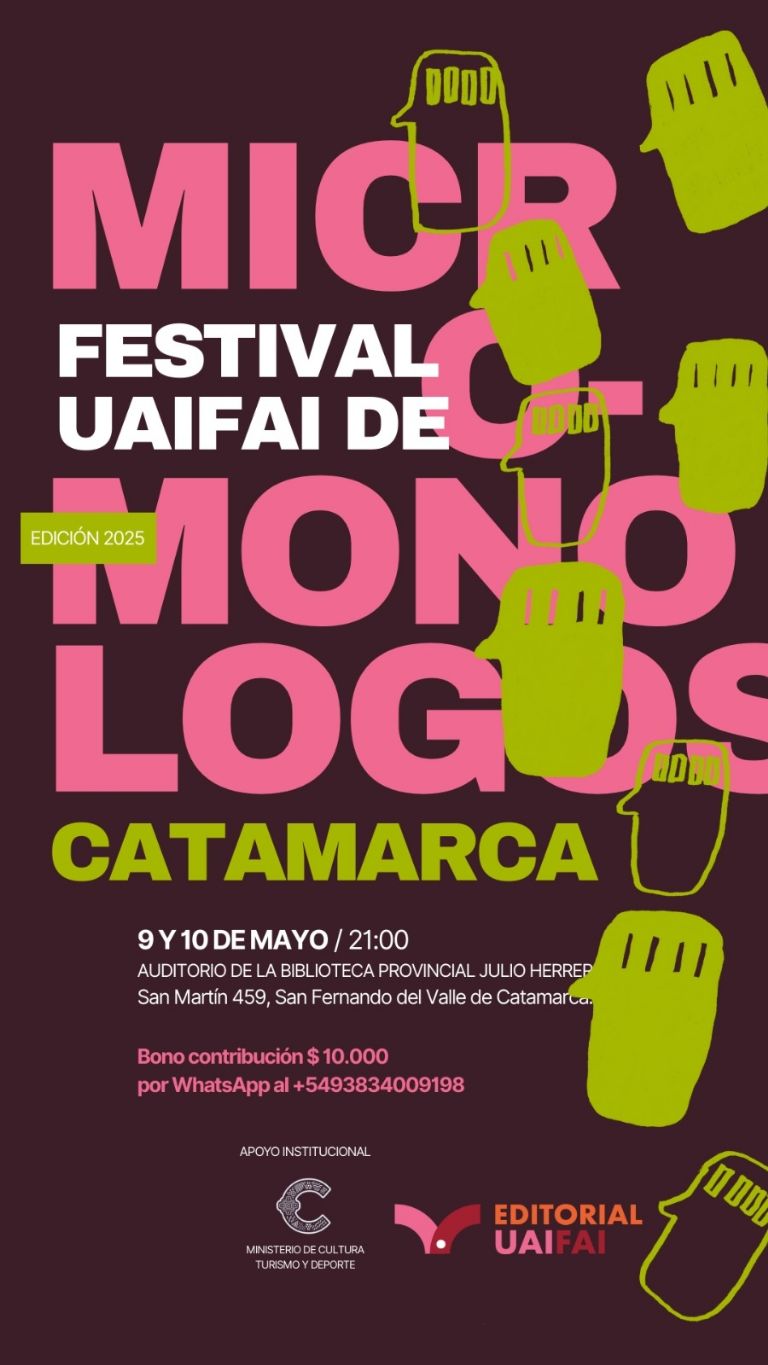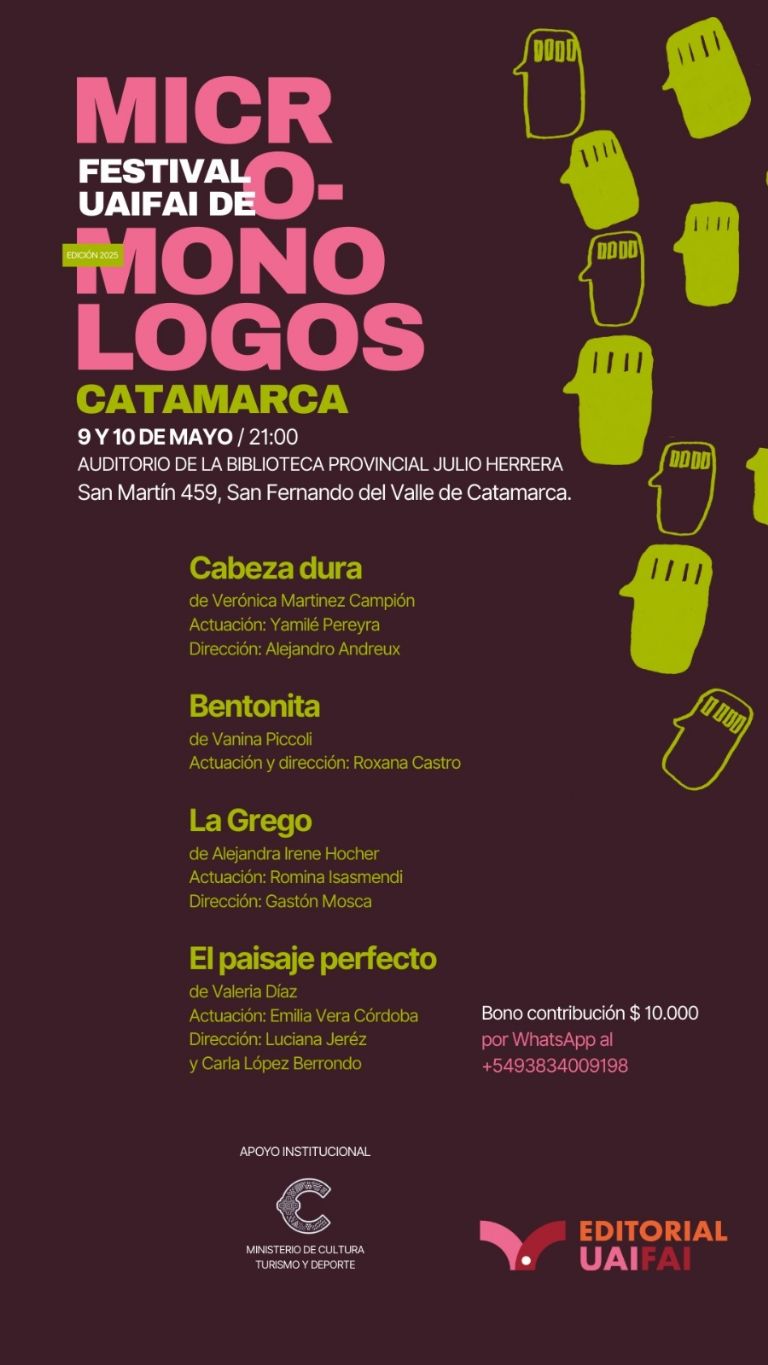 En Catamarca, la propuesta cuenta con cuatro micromonólogos, uno de los cuales está dirigido y protagonizado por dos teatristas de Belén. Los trabajos en escena son Cabeza dura, de Verónica Martínez Campión y protagonizado por Yamilé Pereyra bajo la dirección de Alejandro Andreux; Bentonita, de Vanina Piccoli, con actuación y dirección de Roxana Castro; La Grego, de Alejandra Irene Hocher, interpretado por Romina Isasmendi y dirigido por Gastón Mosca; y El paisaje perfecto, de Valeria Díaz, a cargo de Emilia Vera Córdoba y dirigido por las profesionales Luciana Jerez y Carla López Berrondo. Cada función tendrá una duración aproximada de una hora, con textos que abordan, desde la brevedad y la potencia del formato, las urgencias poéticas, políticas y estéticas de nuestra era.