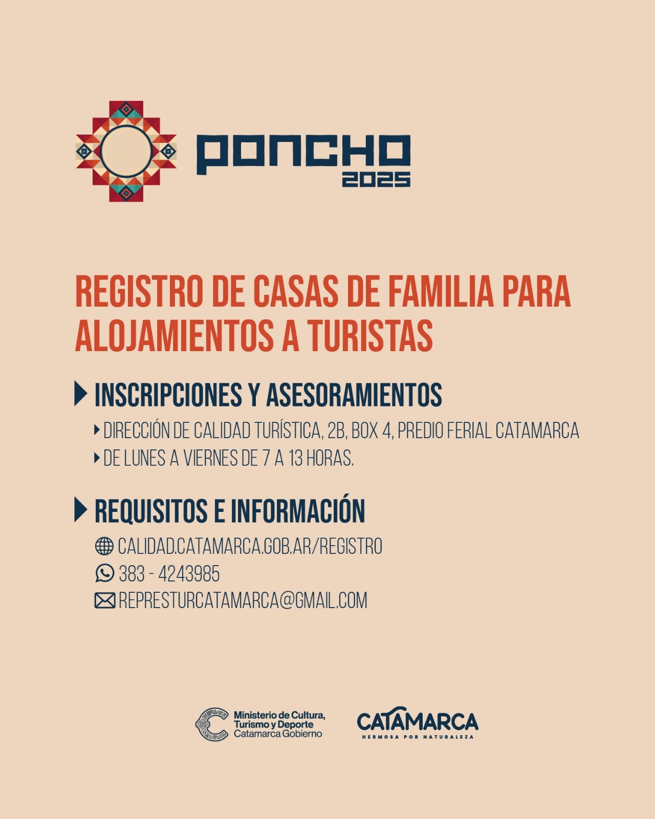 En el marco de la edición 54ª de la Fiesta Nacional e Internacional del Poncho, que se realizará del 18 al 27 de julio en el Predio Ferial Catamarca, el Ministerio de Cultura, Turismo y Deporte y la Secretaría de Gestión Turística, a través de la Dirección de Calidad Turística, invitan a propietarios de casas de familia ubicadas en el casco céntrico y barrios adyacentes que posean habitaciones o departamentos disponibles para recibir a turistas durante los días de realización de la fiesta a inscribirse en las oficinas del Ministerio.