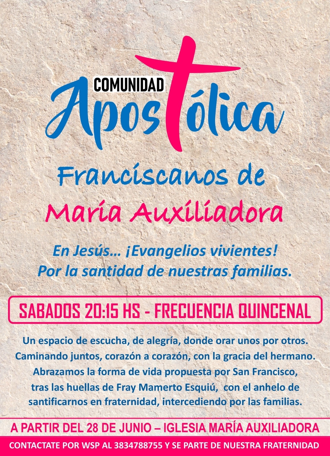 Luego de su presentación, el pasado 8 de junio, la Comunidad Apostólica Franciscanos María Auxiliadora definió que sus reuniones se realizarán los sábados a las 20.15, cada quince días, a partir del próximo 28 del corriente, en el templo de María Auxiliadora, Avda. Gdor. Galíndez 550, ciudad capital.