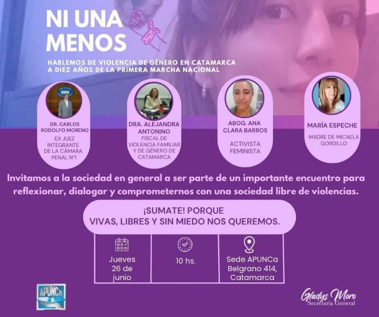 A una década de la histórica primera marcha de Ni Una Menos, Catamarca se suma nuevamente al llamado nacional con un espacio de reflexión, denuncia y compromiso social. Bajo el lema "Hablemos de violencia de género en Catamarca", este jueves 26 de junio a las 10:00 hs se realizará un conversatorio abierto en la sede de la Asociación del Personal de la Universidad Nacional de Catamarca (APUNCa), ubicada en Av. Belgrano 414.