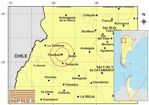 Epicentro: 42 km al N de Tinogasta; 55 km al O de Belén; 88 km al SE de La Tambería -27.693 (lat) -67.588 (long)