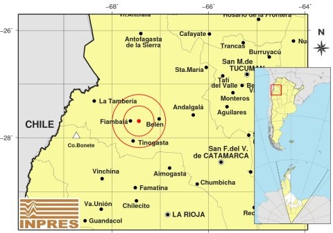 Epicentro: 21 km al NE de Tinogasta; 51 km al SO de Belén; 97 km al NO de Aimogasta -27.901 (lat) -67.461 (long)