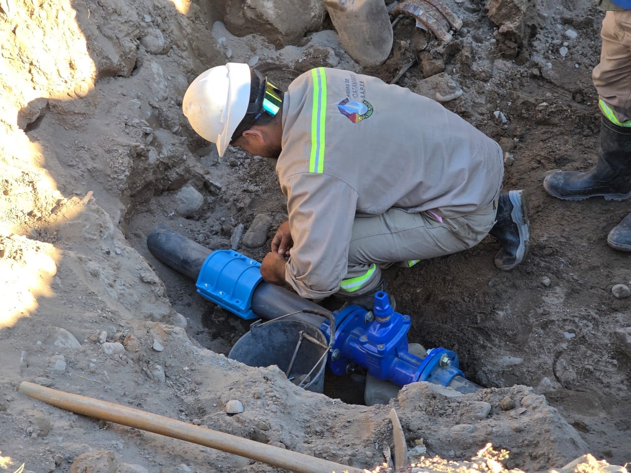 Aguas de Catamarca informó que trabaja en la reparación de cañería de 600 mm en calle Junín y La Rioja.