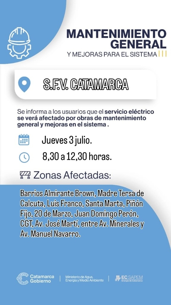 La empresa de energía EC SAPEM informó que este jueves 3 de julio se realizará un corte de energía programado, debido a tareas de mantenimiento general y mejoras en el sistema.