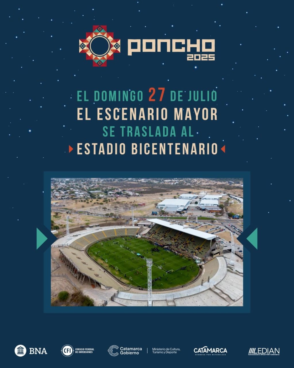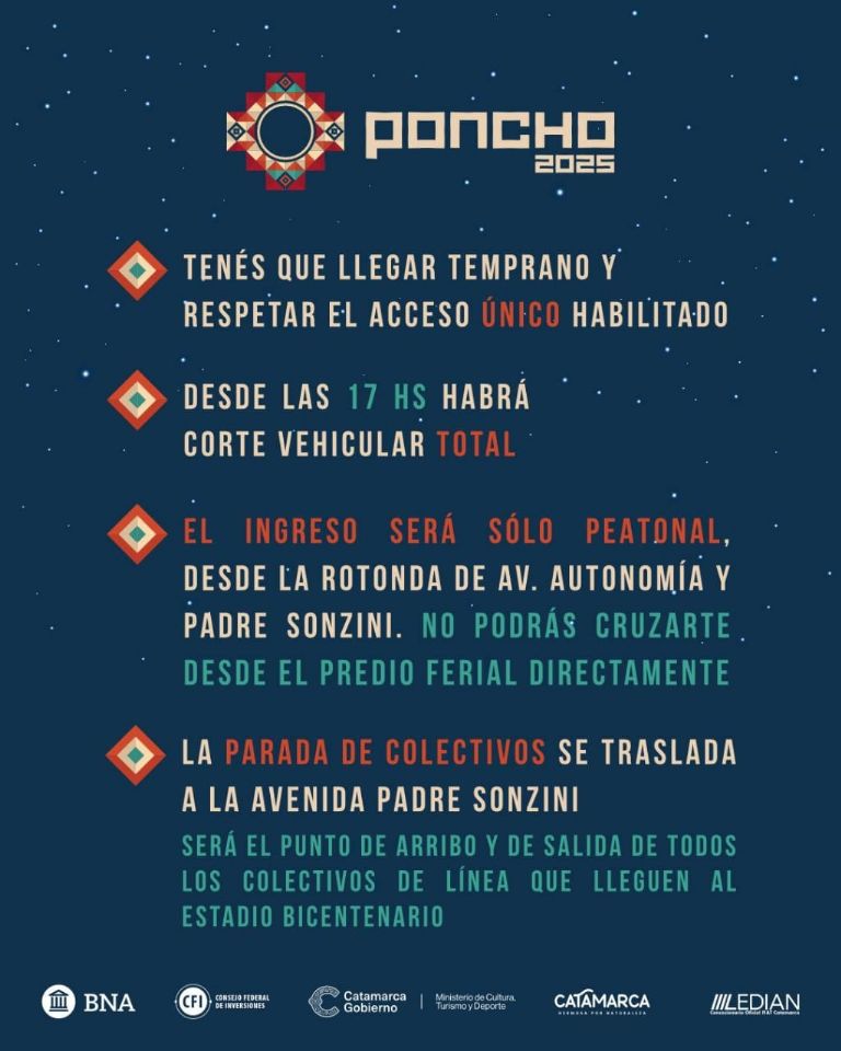 Con motivo del gran cierre del Festival del Poncho 2025, el domingo 27 de julio, se llevará a cabo un operativo especial de seguridad en el Estadio Bicentenario. El traslado del escenario mayor al Estadio motivó una planificación diferenciada, orientada a garantizar la seguridad de los asistentes y el normal desarrollo del evento en una infraestructura de mayores dimensiones.