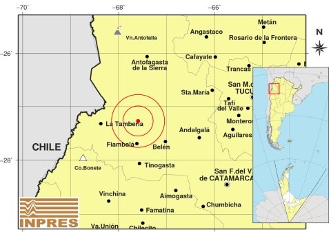 Epicentro: 64 km al SO de Culampajá; 70 km al NO de Belén; 77 km al E de La Tambería -27.269 (lat) -67.594 (long)