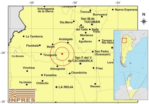 Epicentro: 59 km al SO de Andalgalá; 61 km al N de Aimogasta; 62 km al SE de Belén -28.048 (lat) -66.585 (long)