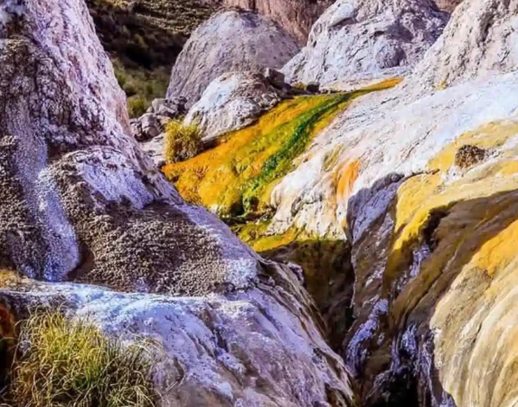Llama la atención los colores rojizos del sustrato por donde pasa el agua caliente y las costras de minerales acumulándose de a poco en los bordes del manantial. El agua termal sale de los pozos muy calientes, pero al fluir hacia un arroyo va disminuyendo su temperatura.