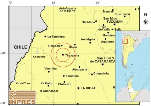 Epicentro: 0 km al S de Tinogasta; 70 km al SO de Belén; 91 km al NO de Aimogasta -28.071 (lat) -67.560 (long)