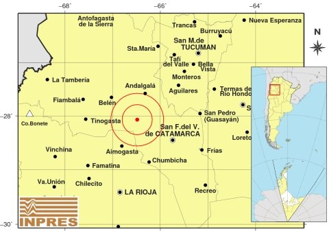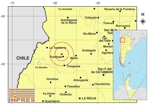 Epicentro: 55 km al N de Tinogasta; 65 km al O de Belén; 74 km al SE de La Tambería -27.588 (lat) -67.687 (long)