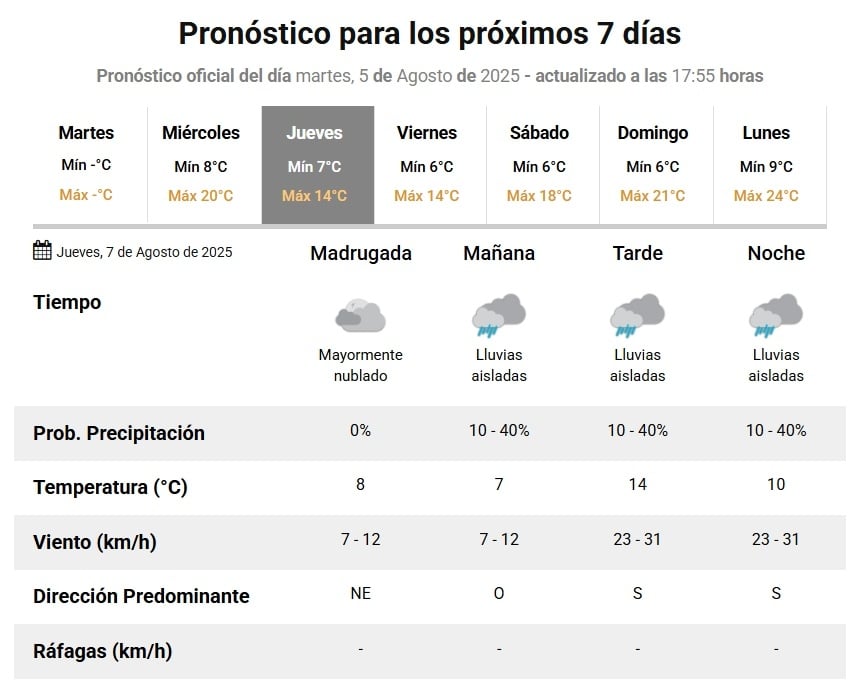 Según el Servicio Meteorológico Nacional, el jueves la mínima será de 7° y la máxima de 14°. El viernes, la mínima bajará un poquito y se espera que no supere los 6°, mientras que la máxima también llegaría a los 14°.