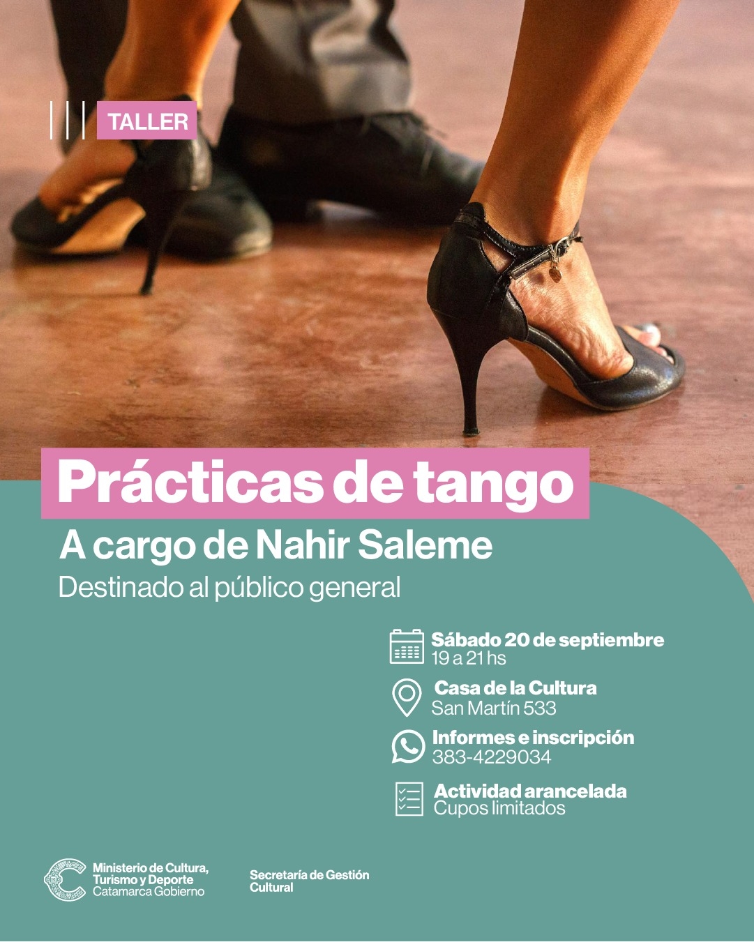 La Dirección de Patrimonio y Museos invita a participar de un nuevo espacio dedicado a los amantes del tango. El próximo sábado 20 de septiembre, de 19 a 21, se llevará a cabo el taller “Prácticas de Tango”, coordinado por la tallerista Nahir Saleme, en la Casa de la Cultura, San Martin 533.