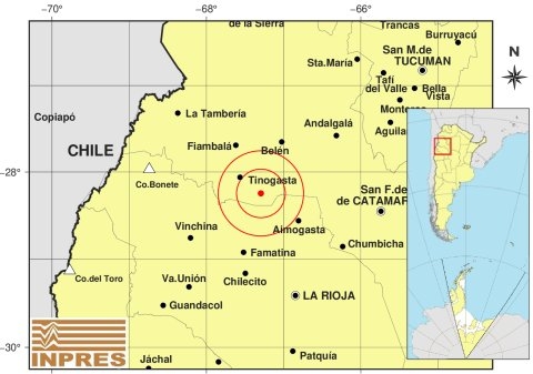 Epicentro: 33 km al SE de Tinogasta; 59 km al NO de Aimogasta; 71 km al S de Belén -28.246 (lat) -67.294 (long)