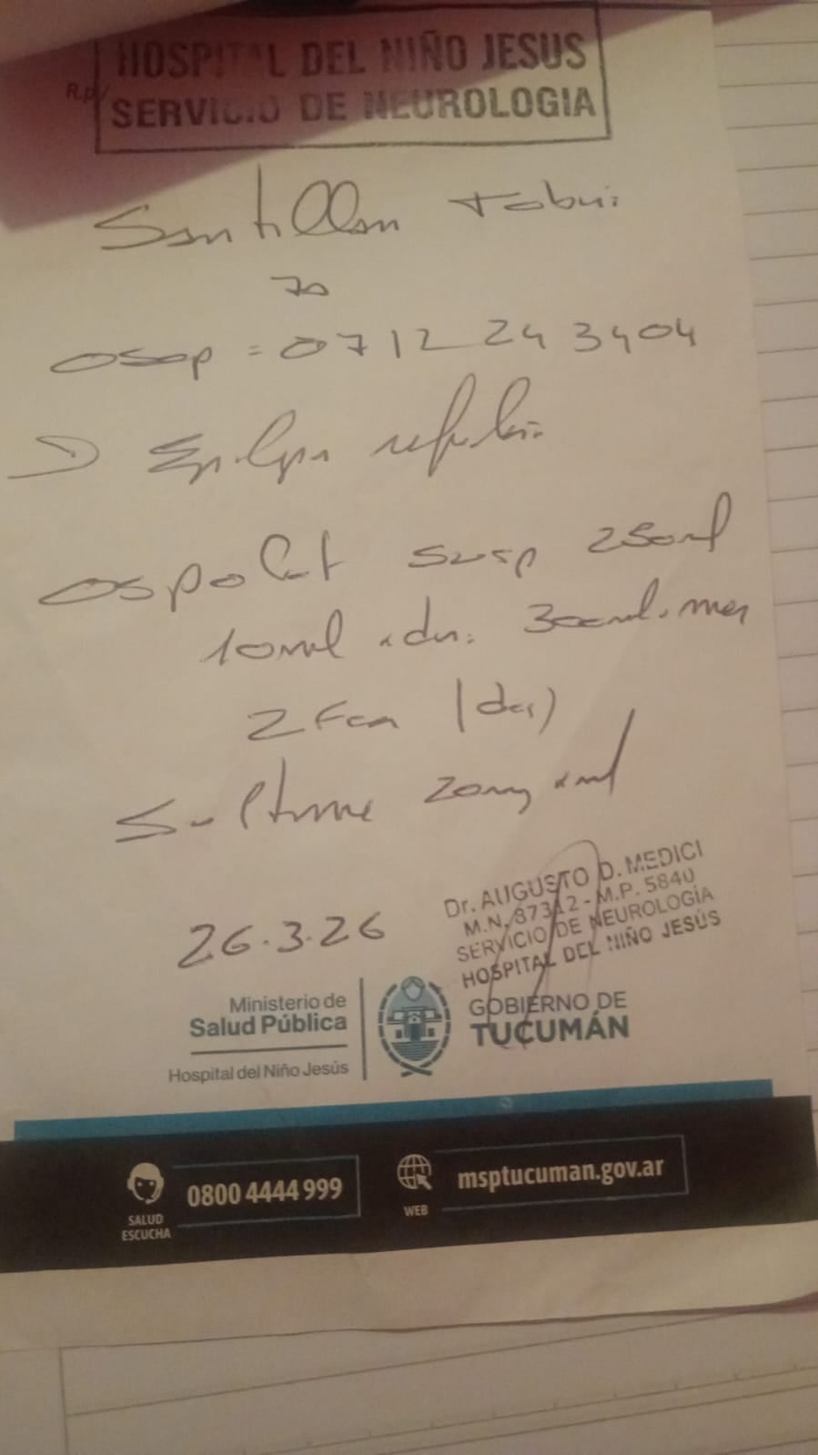 Gisela, madre de Santillán Tobías Nahitan, contó que su hijo —oriundo de Catamarca— se encuentra actualmente en la provincia de Tucumán, donde realiza un tratamiento neurológico. Si bien cuenta con obra social, no dispone del carnet de discapacidad, lo que impide que el medicamento indicado sea cubierto.