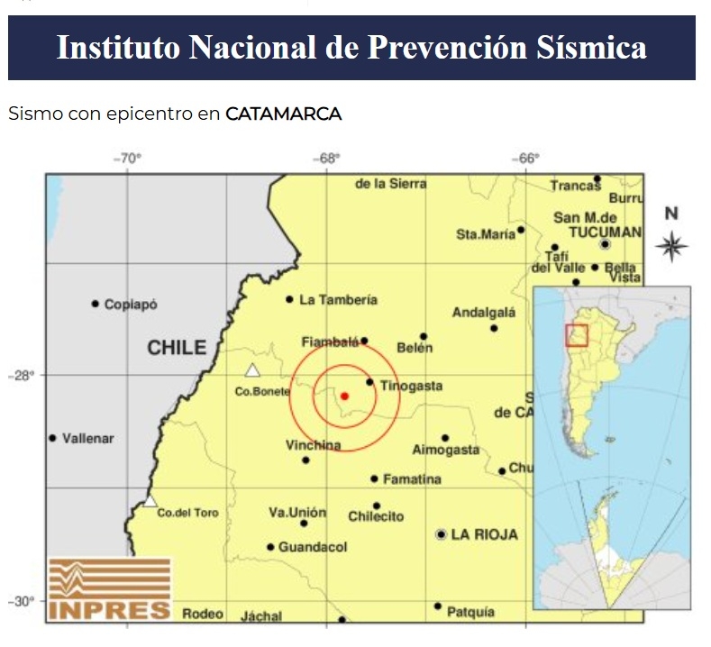 Epicentro: 28 km al SO de Tinogasta; 73 km al NE de Vinchina; 94 km al E de Cerro Bonete -28.188 (lat) -67.816 (long)