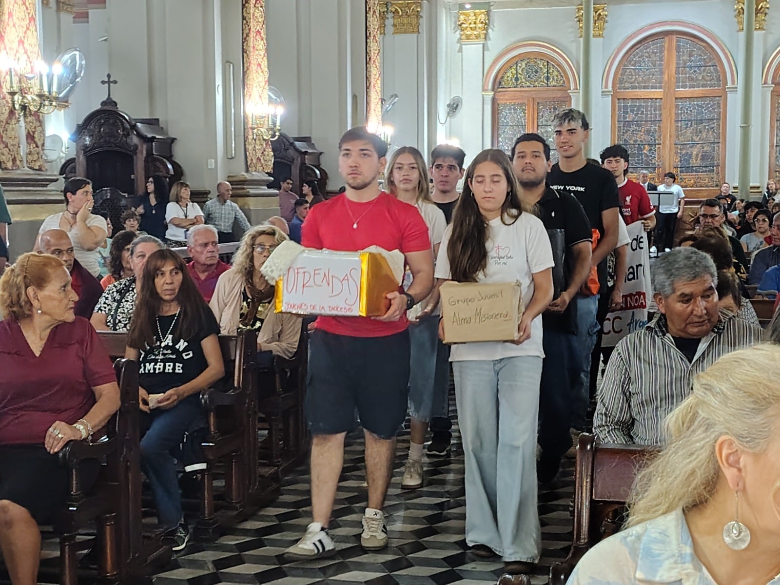 En el momento del ofertorio, los alumbrantes acercaron al altar elementos que serán destinados a la atención de los hermanos peregrinos, junto con los dones del pan y del vino.