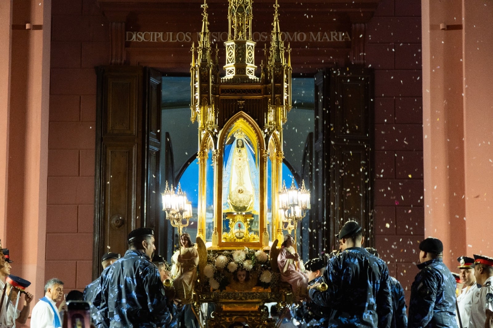 Concluido este momento se dispuso la ubicación de las religiosas y religiosos, sacerdotes del clero local y de otras diócesis, y del obispo diocesano, Mons. Luis Urbanc, acompañado por el obispo emérito de Neuquén, Mons. Virginio Domingo Bressanelli (SCJ), para dar inicio a la Solemne Procesión con la Santísima Madre del Valle escoltada por la Guardia de Honor de los Bomberos de la Policía de Catamarca, y precedida por la imagen del Beato Mamerto Esquiú.