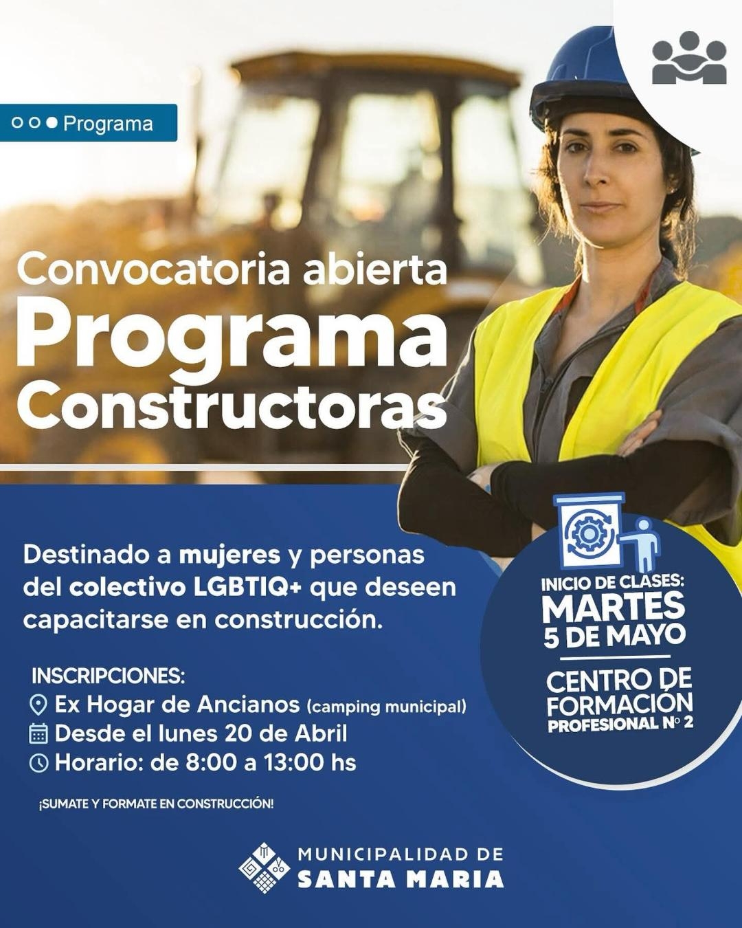 Se encuentra abierta la inscripción al Programa Constructoras, una propuesta de formación orientada a mujeres y personas del colectivo LGBTIQ+ interesadas en capacitarse en el ámbito de la construcción.